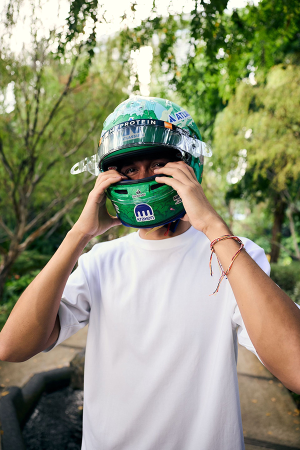 หมวกกันน็อกใบนี้ออกแบบโดยคาร์ลอตตา เฟรเออร์ (Karlotta Freier) ถ่ายทอดแรงบันดาลใจจากลวดลายไทยและเอเชียที่สะท้อนถึงภูมิลำเนาของอัลบอนในเอเชียตะวันออกเฉียงใต้ โดยเขาจะสวมใส่หมวกใบดังกล่าวลงแข่งขันในรายการ สิงคโปร์กรังด์ปรีซ์ ระหว่างวันที่ 3–5 ตุลาคม 2568 การประมูลเริ่มต้นที่ 450,000 บาท (ประมาณ 14,100 ดอลลาร์สหรัฐ) เปิดแล้ววันนี้จนถึงวันที่ 15 ตุลาคม 2568 ที่ www.unicef.or.th/alex
